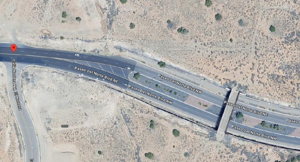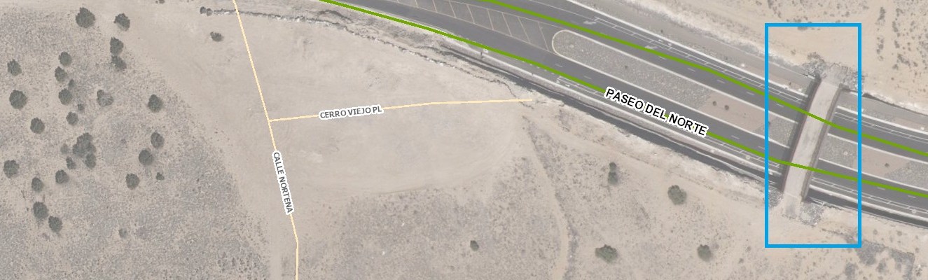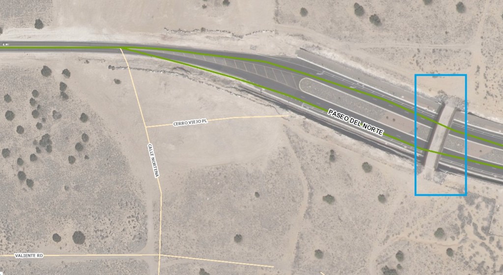 In our extremely mimimal “planning” for the ride, I’d seen info about the Open Space and also spotted this weird pedestrian bridge that goes over Paseo del Norte in what has been the middle of nowhere ever since the infamous “Paseo Extension Project” back in 2007. Here are two excerpts from the City’s “Historical Aerial Maps,” first in 2006 at the beginning of construction and then post-construction in 2008.