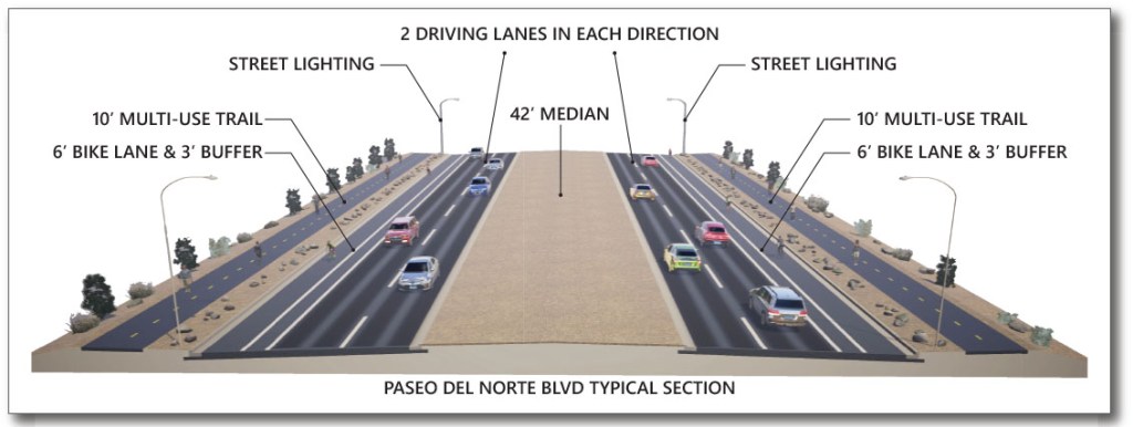 As is the custom now, there’s a website devoted to the project, with renderings and little videos illustrating what both stroads are gonna look like at completion. Here is what’s scheduled to happen on Paseo del Norte.
