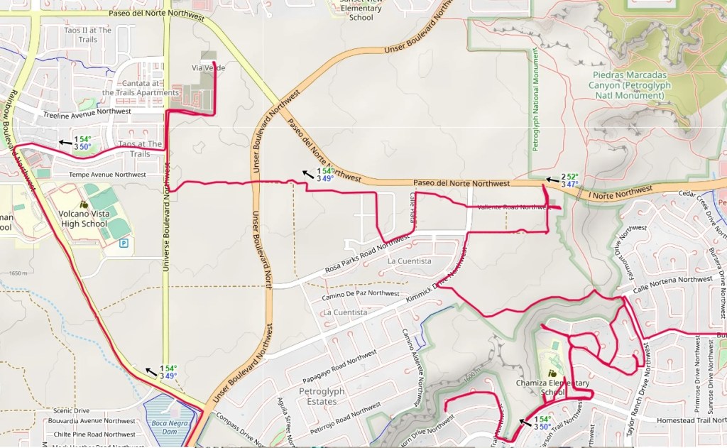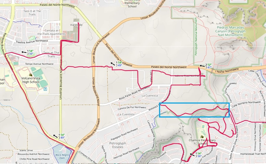 The really LSD spider “routing” toward the bottom right above skirted Petroglyph National Monument and, after trying to break into (the back parking lots) of Chamiza Elementary, left civilization at the very exciting (to us) Calle Nortena Open Space, which abuts the Monument and heads up an empty (of houses) arroyo over to Kimmick Drive and up to Paseo del Norte.