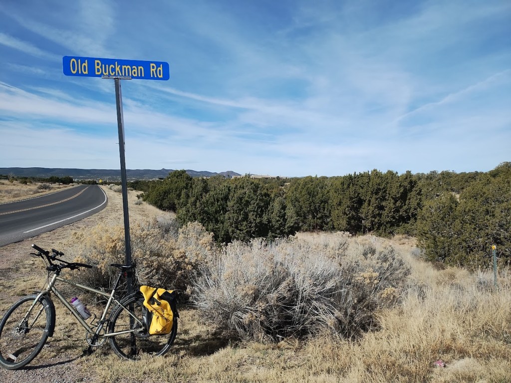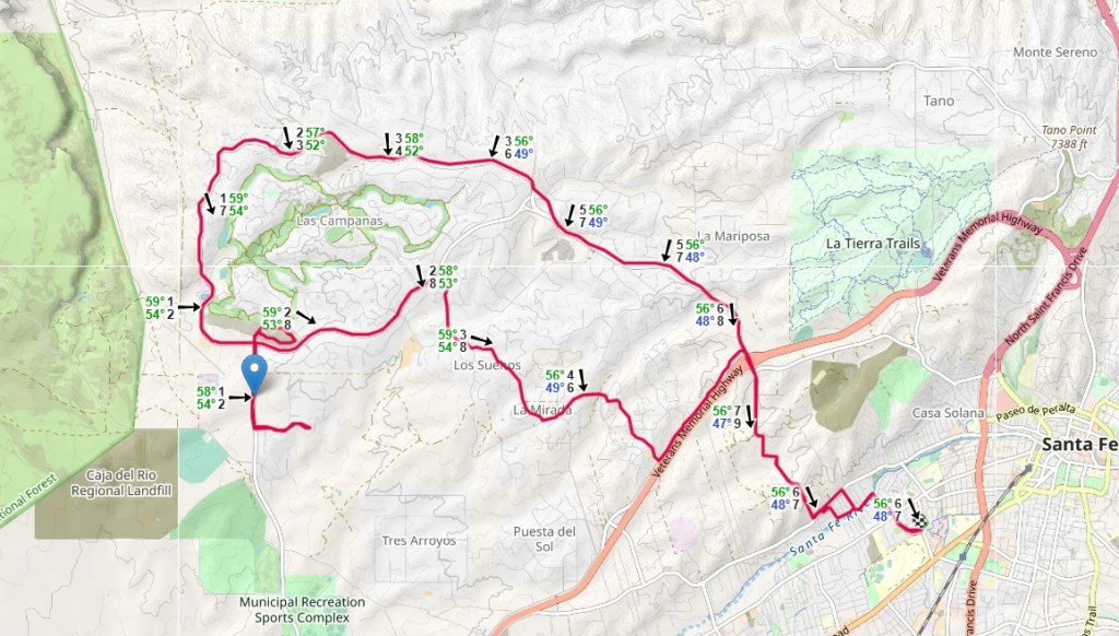 Starting off in town just off the River Trail, I got to see the Spring Trail Maintenance volunteers on the Trail (thanks, volunteers!) before escaping primary civilization up some hills that got the blood moving and crossed NM-599. From then on it was rolling hills, smooth pavement (generally) and the occasional driver (usually courteous). The route looked something like this: