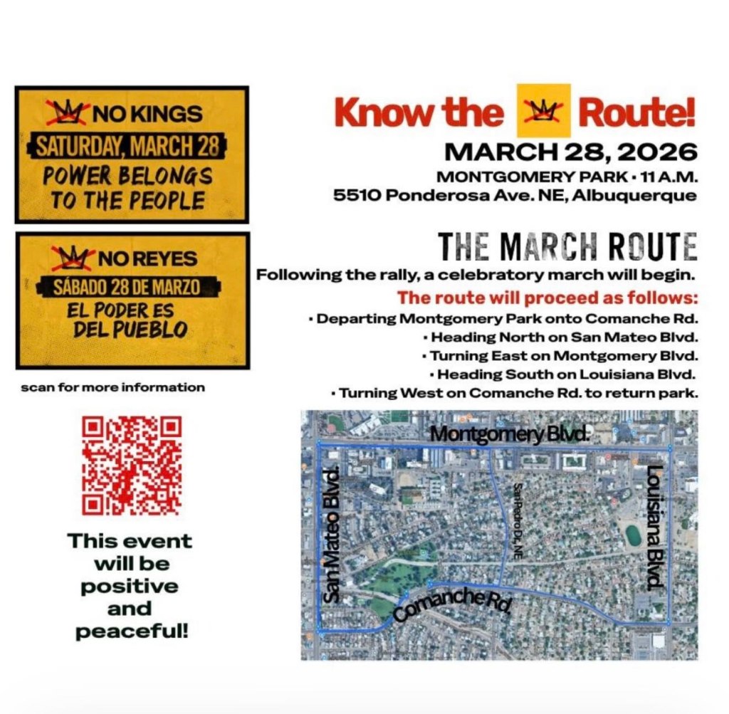 Regarding tomorrow’s Burque iteration of “No Kings Day III,” I first want to express my admiration for the unknown (to me) person who first said/asked at some meeting a while back, “Why don’t we just close San Mateo, Montgomery, Louisiana, and Comanche during the march?”