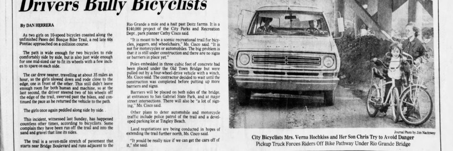 Doing a bit of research into creation of that stretch of multi-modal wonder we Burqueños now take for granted, the Paseo del Bosque Trail. Our most popular stretch of walking/rolling, and only walking/rolling (well, almost) in town didn’t just come with the River as a nature-presented geologic/hydrologic package. It had to be created and it… Read More 1977: Drivers Bully Bicyclists
