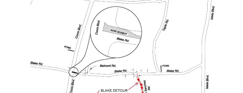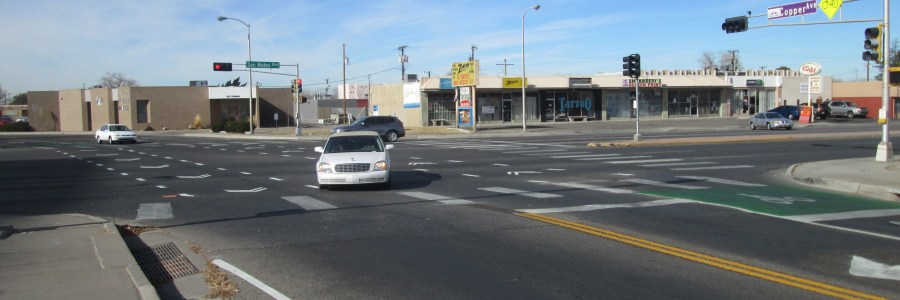 Had the chance to ride the Fair Heights Bike Boulevard earlier this week, and saw the newest look for the intersection of San Mateo and Copper. As the City tries to make the best of San Mateo-meets-Bike Boulevard, a very tough proposition, we see a great number of simultaneous treatments: Let’s see. We have: Intense… Read More The Whites Stripes: Tackling San Mateo at Fair Heights Bike Boulevard