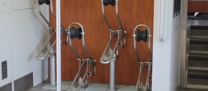 I’d already parked my bike, per usual, at the “bike end” of the Rail Runner car yesterday amid the useless straps and pointless wheel “holders,” when I espied this at the other end of the rail car… Holy Chips Ahoy, that’s a new, seemingly infinite better way to park one’s bike on the train! At… Read More New Rail Runner On-Board Bike Thingee